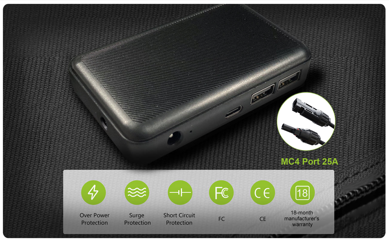 Solar Connector Output can deliver 25A(max)current while the DC port only carries 10A, Dual USB port(5V/2.4A per port) for charging your 5V powered gadgets, and 18V DC output(18V/3A) for charging your laptop or 12V car battery and portable generator, the junction box parallel connecting port for connecting multiple foldable solar panels.
