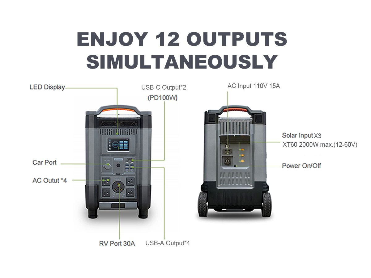 ALLPOWERS R4000 is equipped with one normal output port and one emergency output port.AC output port x 4, USB-C (up to 100W) output port x 2, USB-A (up to 18W) output port x 2, USB-A (up to 12W) output port x 2,Cigarette lighter socket (maximum 120W) output port x 1, RV output port x 1. When hosting a family camp or outdoor event, you can charge everyone's devices at the same time if you have one.