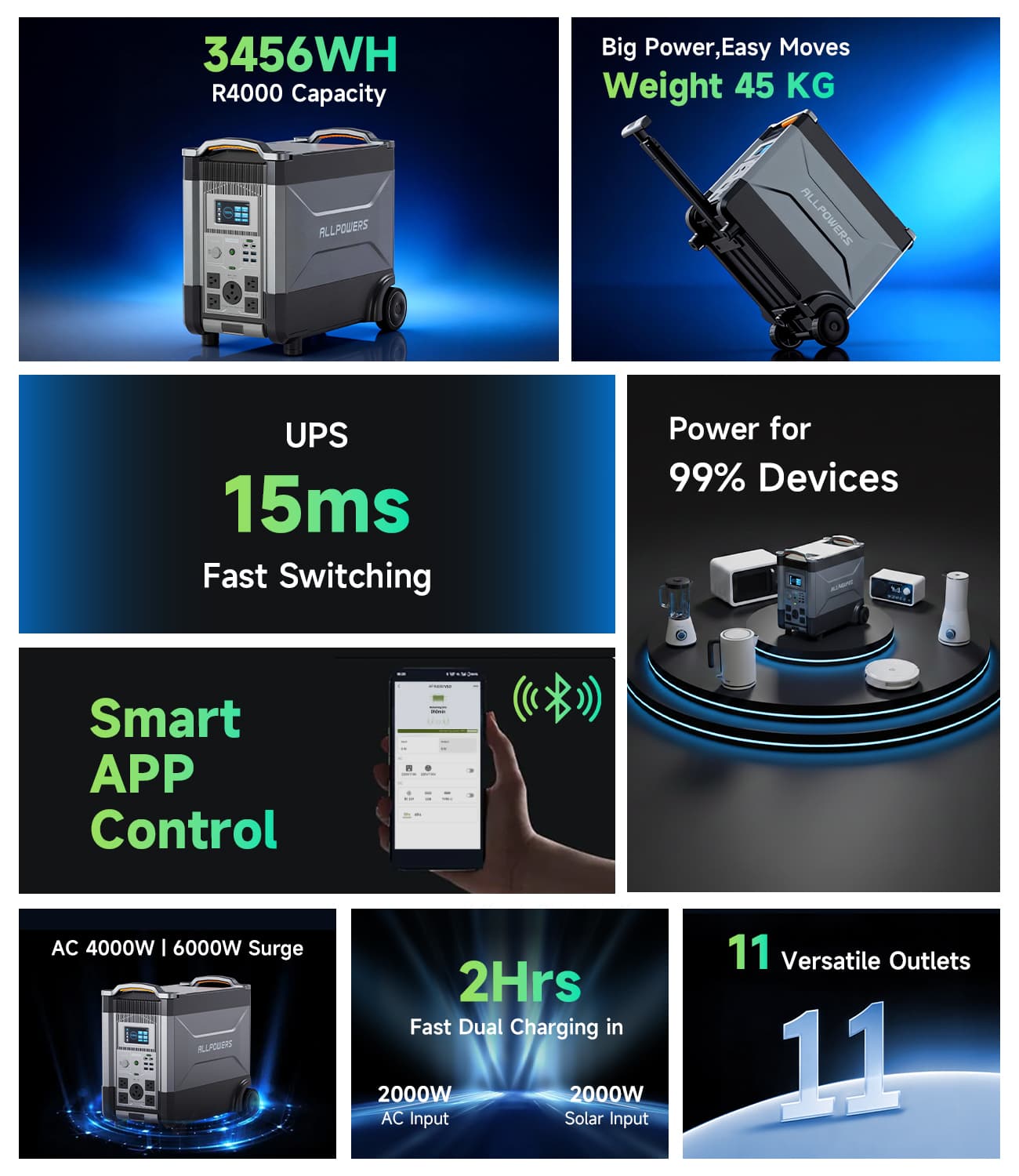 For example, if the R4000 is used to power a 700Wh heater, the runtime would be 3456Wh x 85% ÷ 700 ≈ 4hours.