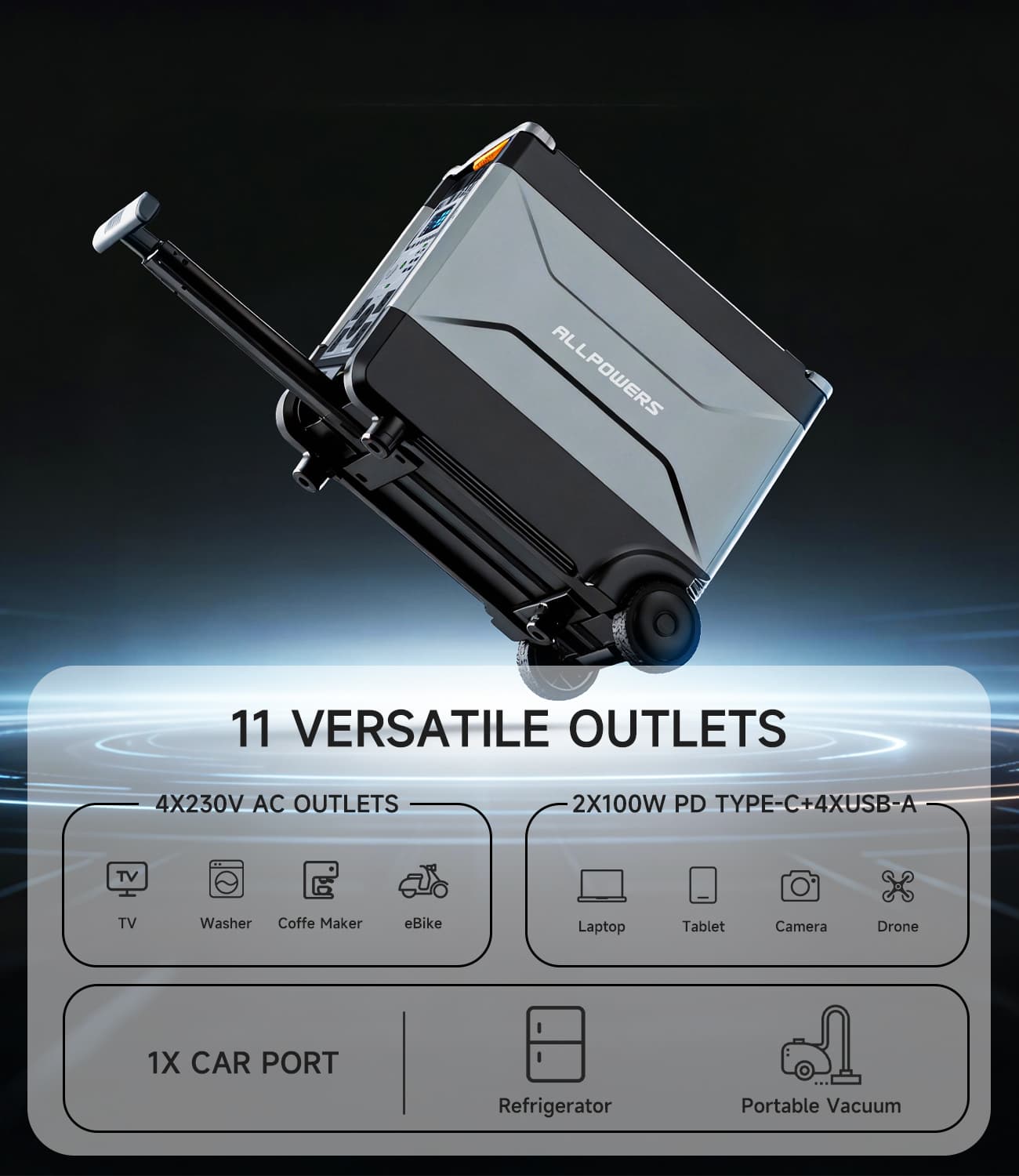 ALLPOWERS R4000 is equipped with one normal output port and one emergency output port.AC output port x 4, USB-C (up to 100W) output port x 2, USB-A (up to 18W) output port x 2, USB-A (up to 12W) output port x 2,Cigarette lighter socket (maximum 120W) output port x 1, RV output port x 1. When hosting a family camp or outdoor event, you can charge everyone's devices at the same time if you have one.