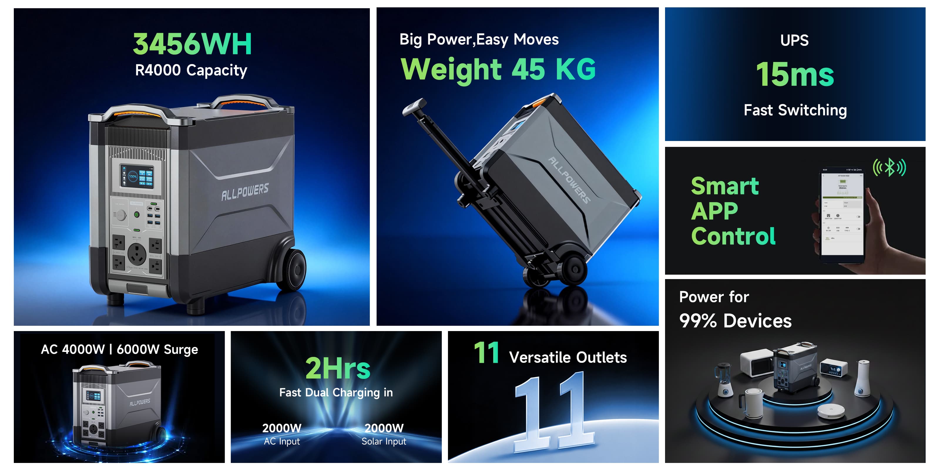 The R4000 has a 4000W AC output (6000W peak), allowing you to power devices with a rated power of up to 4000W and a peak power of up to 6000W.
