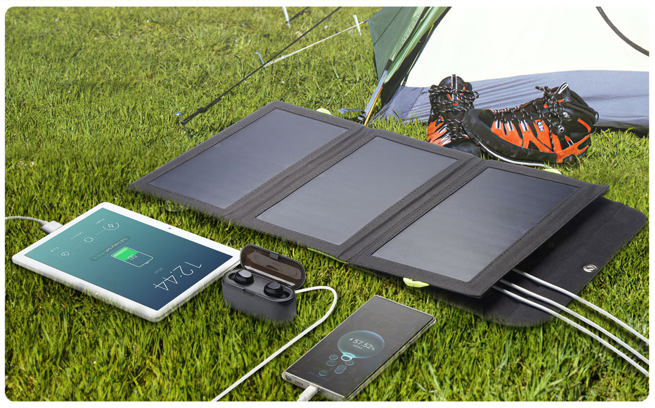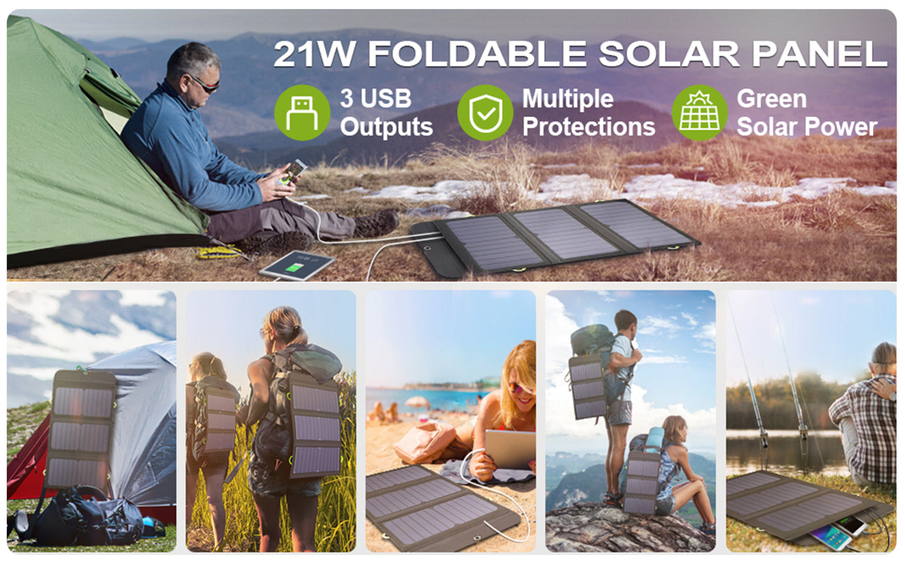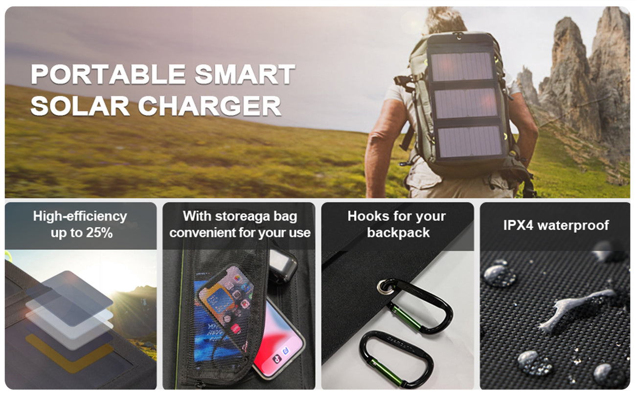 With 10000mah high capacity, the solar panel can be used as a portable charger. When it is a power outage, you can recharge from solar power or wall charge( there’s a micro input port), great for a week-long trip.