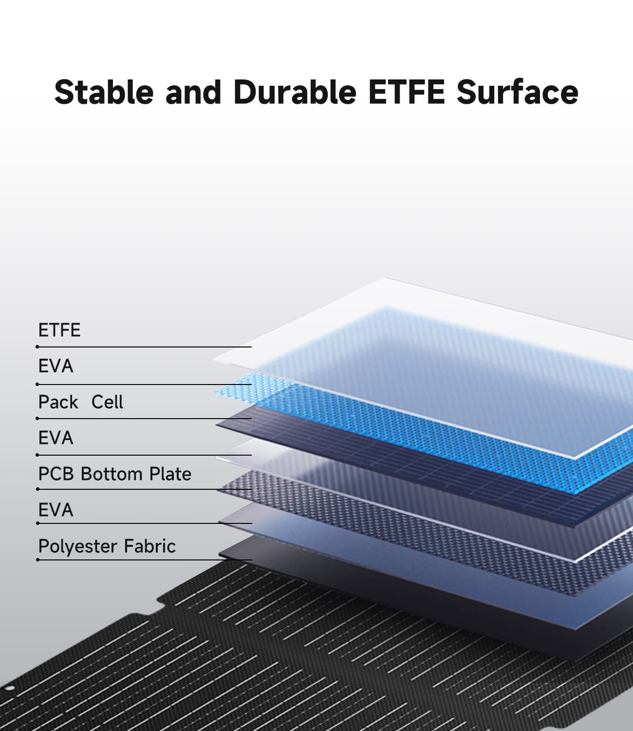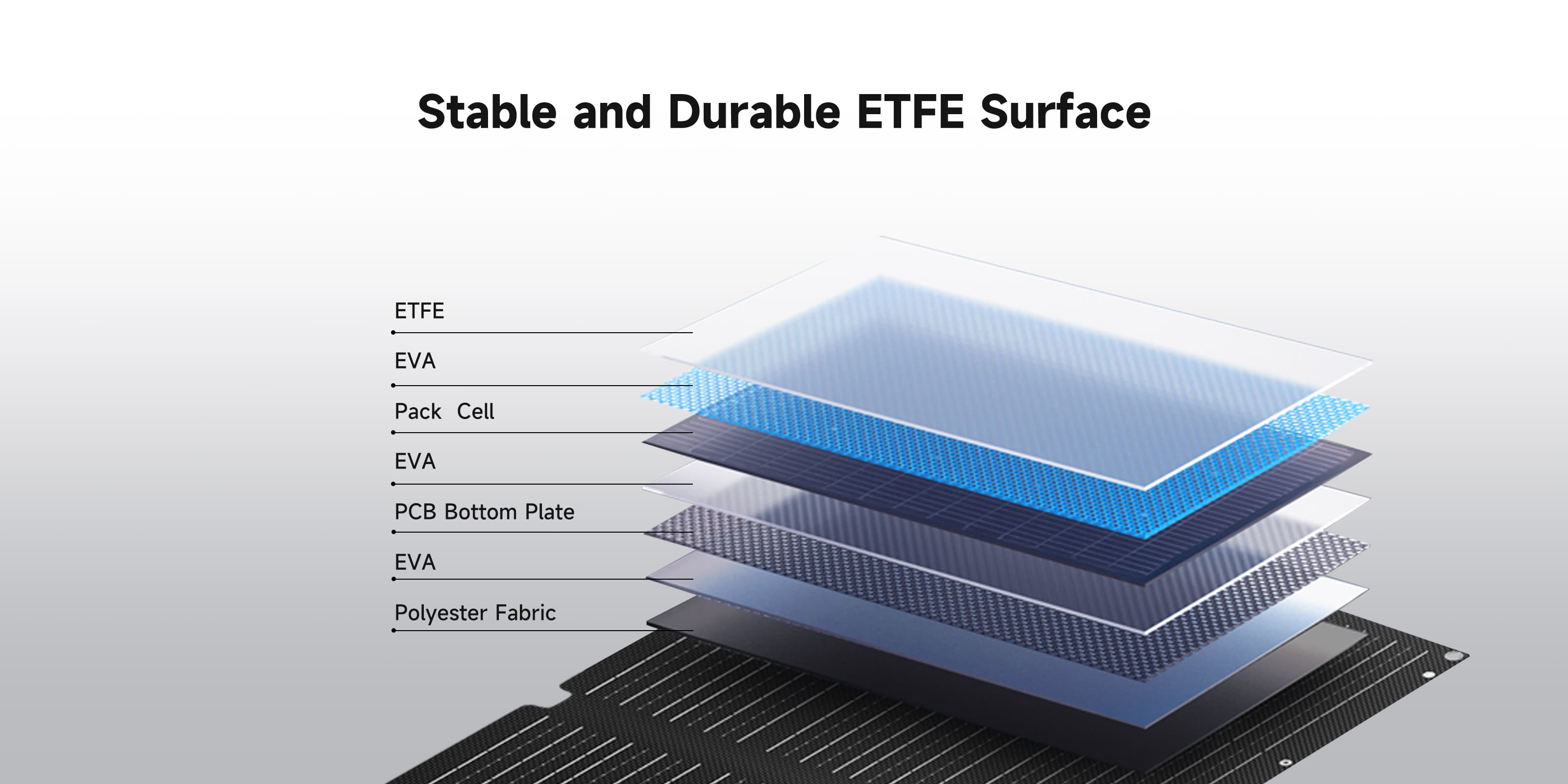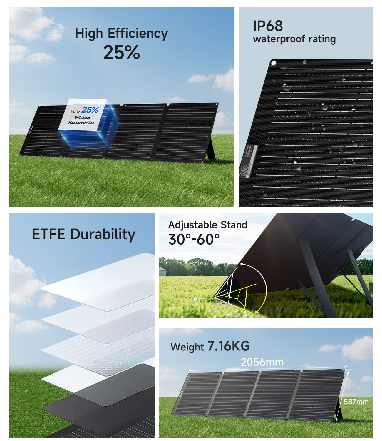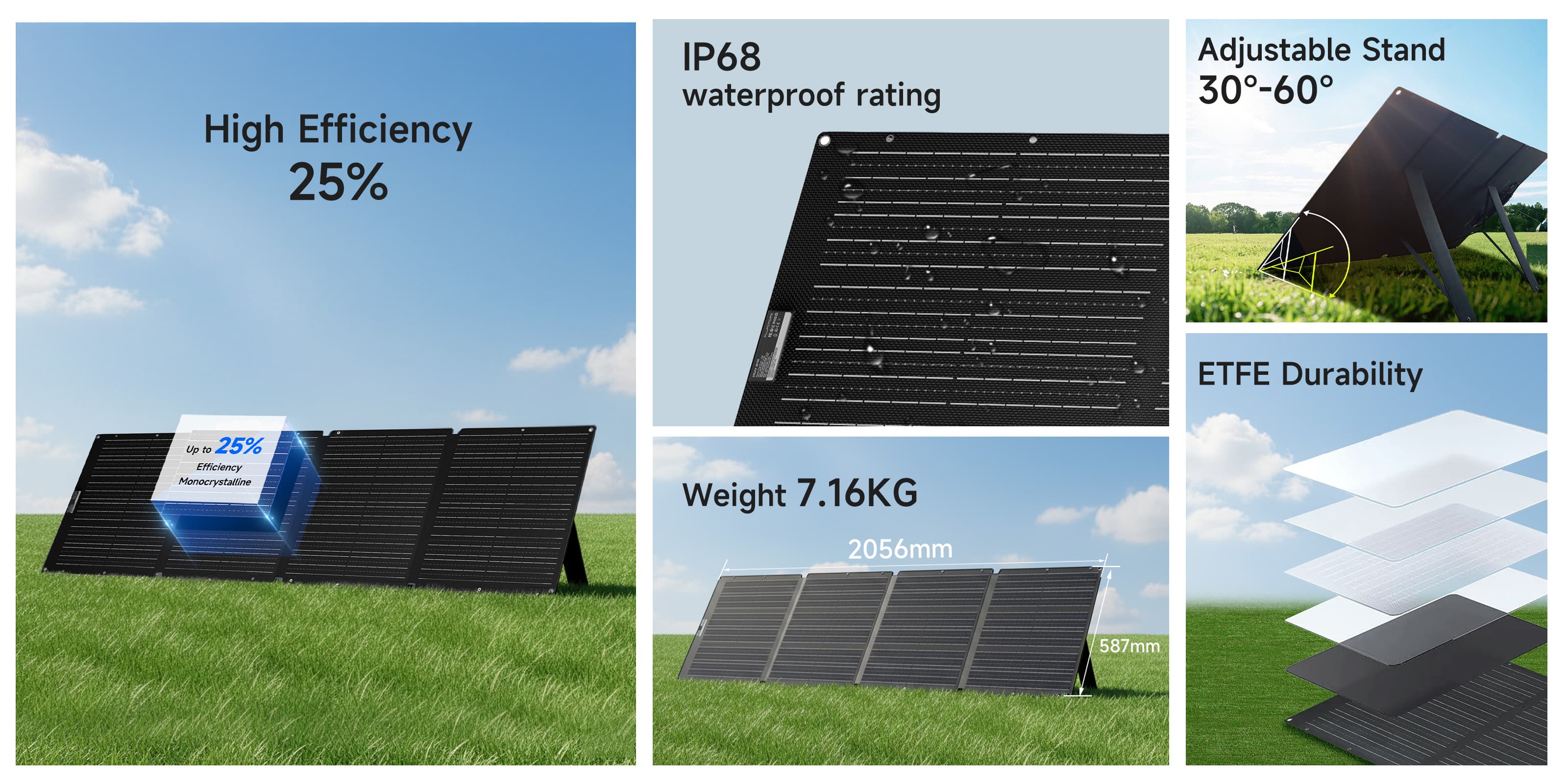 - High 23–25 % efficiency ETFE surface for max sunlight capture