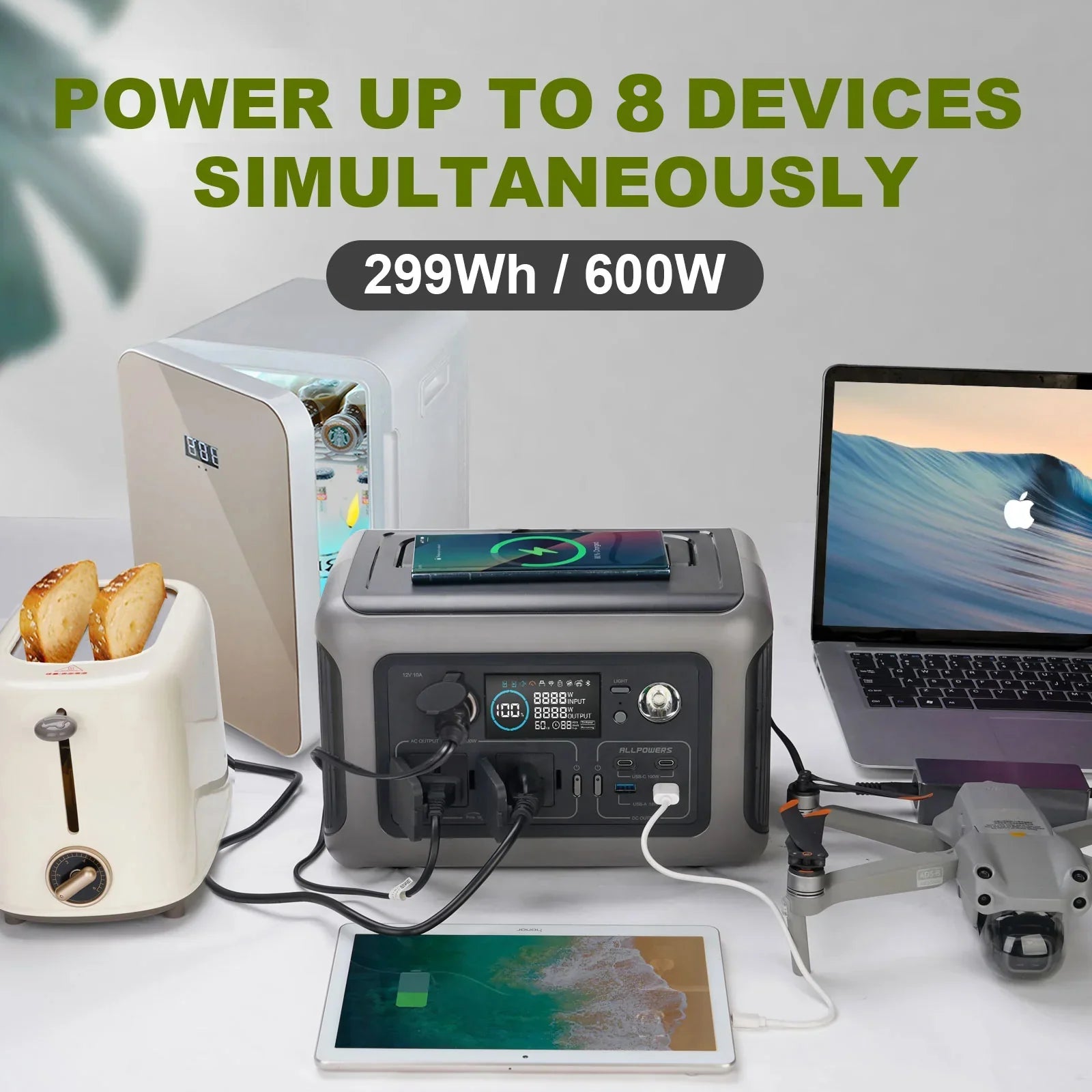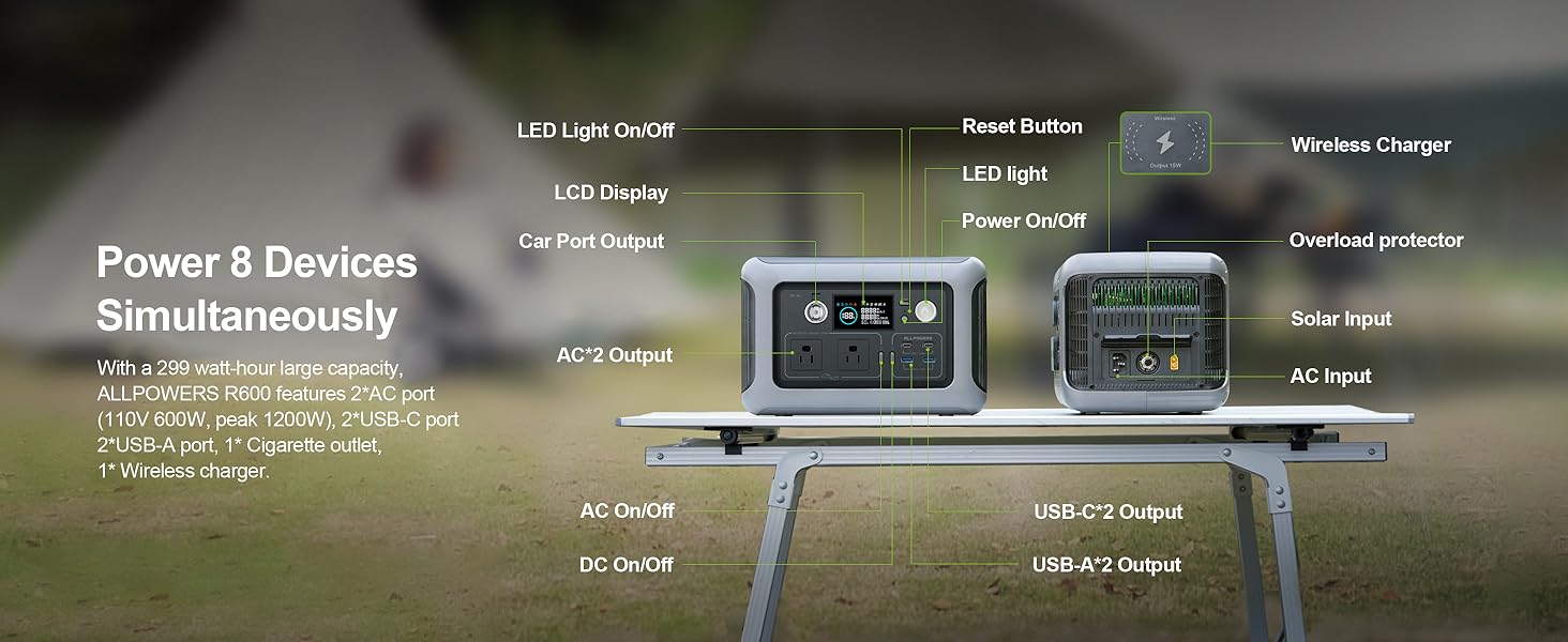 ALLPOWERS portable power station features 2* AC outlets (110V 600W, 1200W Peak), 2 * USB-C ports, 2* USB-A ports and , 1* car cigarette lighter (12V/10A) and a 15W wireless charger . With an output of up to 600W, ALLPOWERS R600 outdoor generator is specially designed for charging kettle, juice, laptops, car refrigerator, drone and other outdoor electronics, power your outdoor adventure without worry.